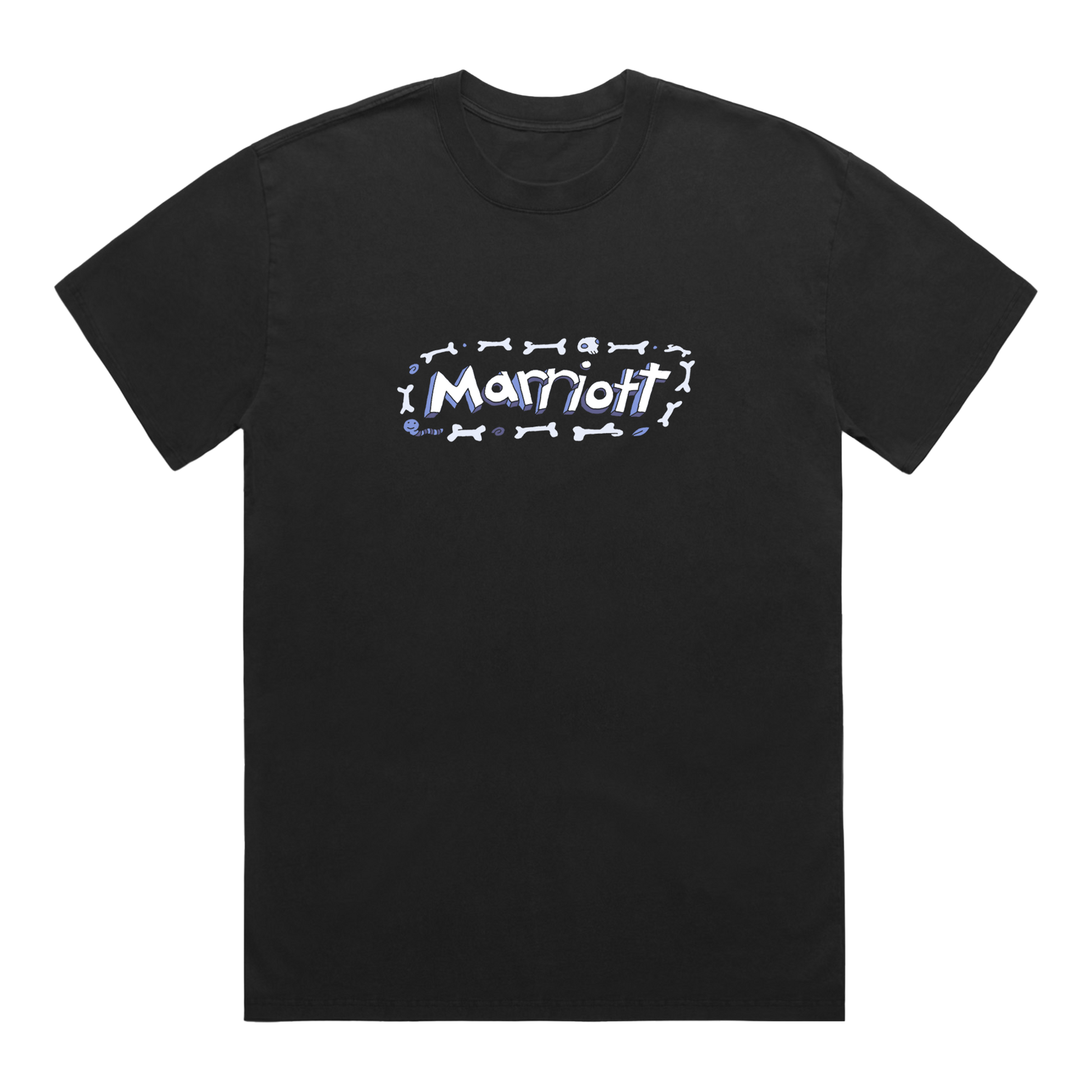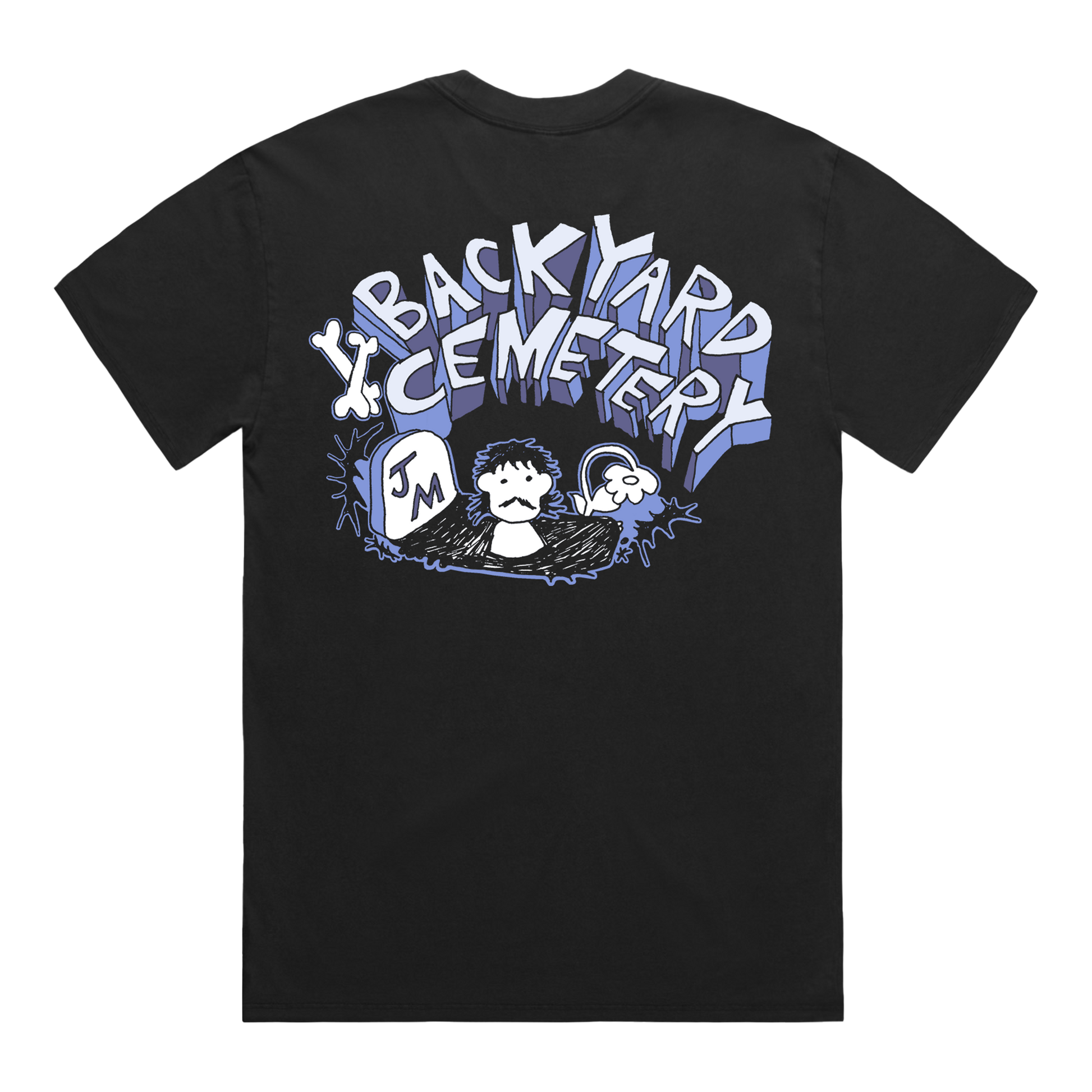 'Marriott' bones graphic printed on the front and 'Backyard Cemetary' graphic printed on the back of a black, unisex tee.