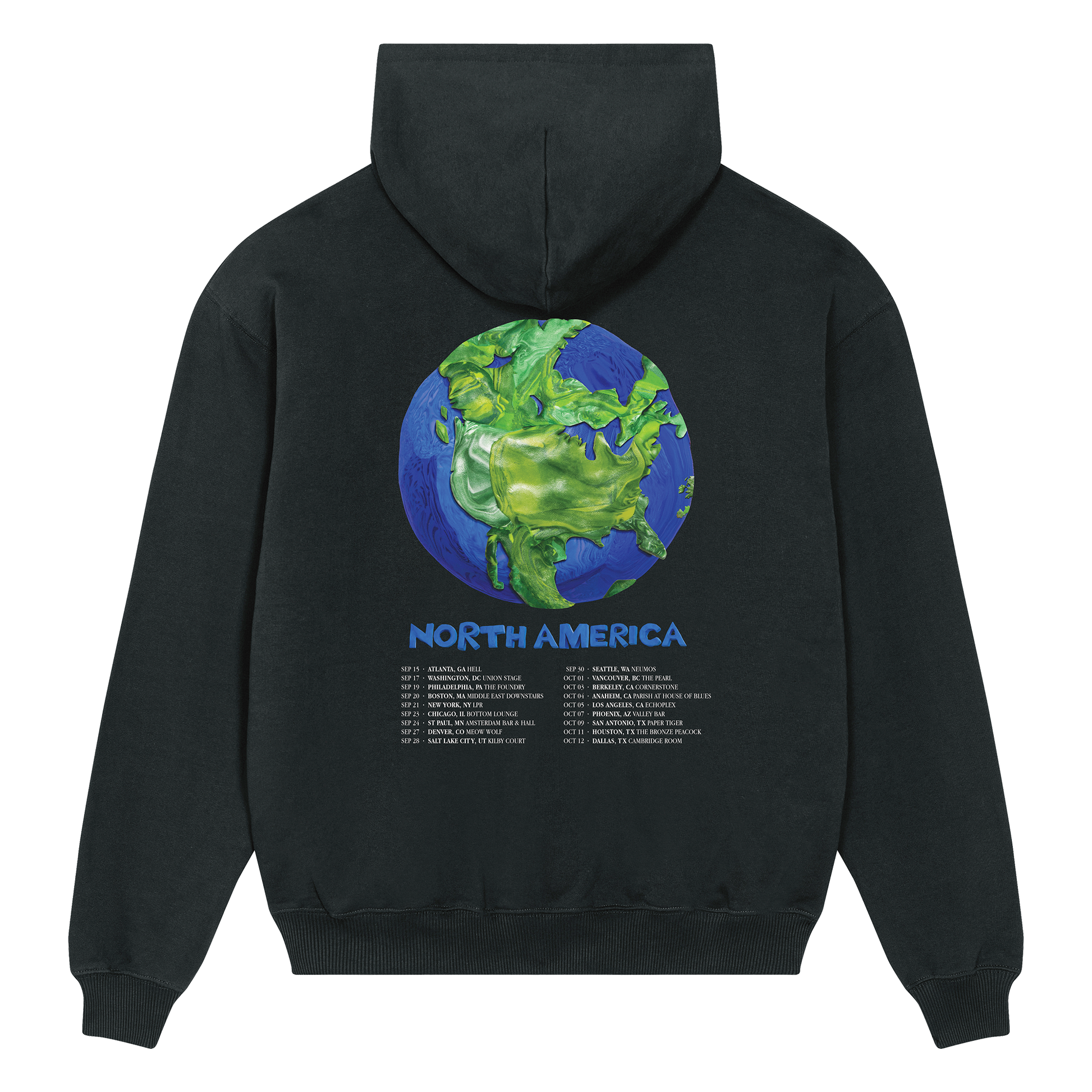 'Marriott 2025' graphic printed on the front and Earth graphic with tour dates printed on the back of a black, unisex hoodie.