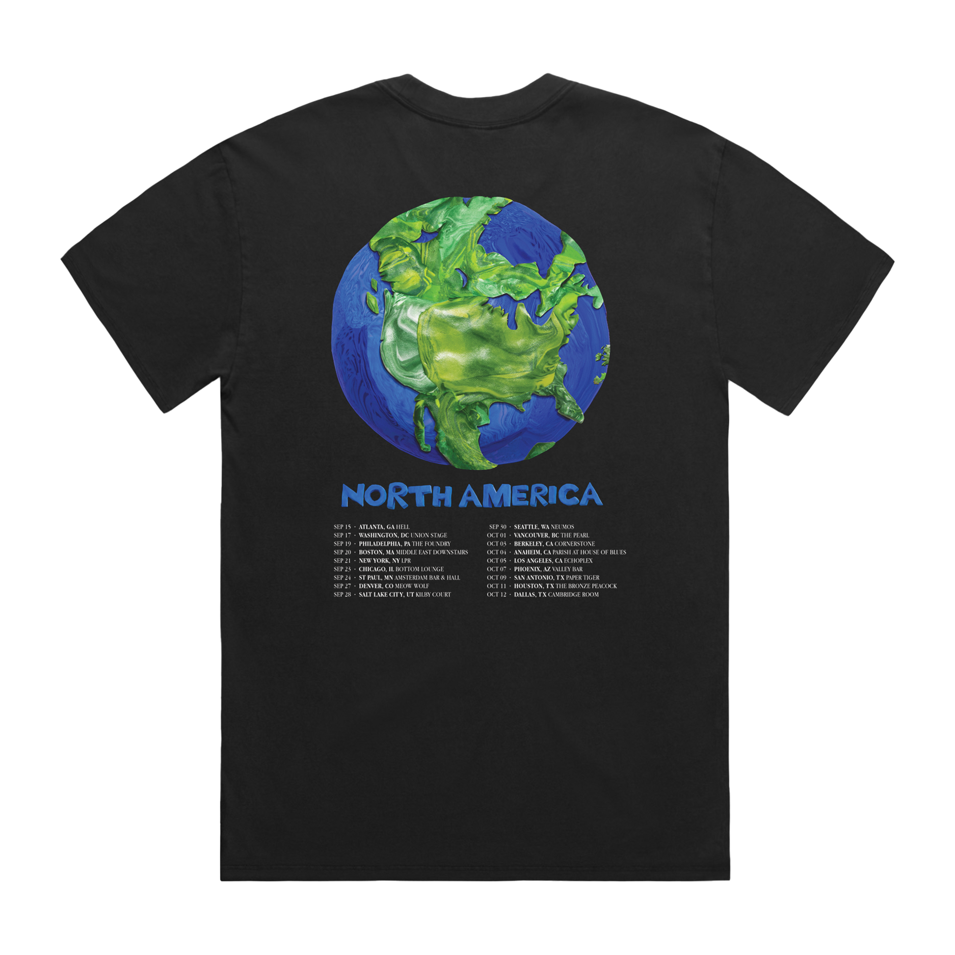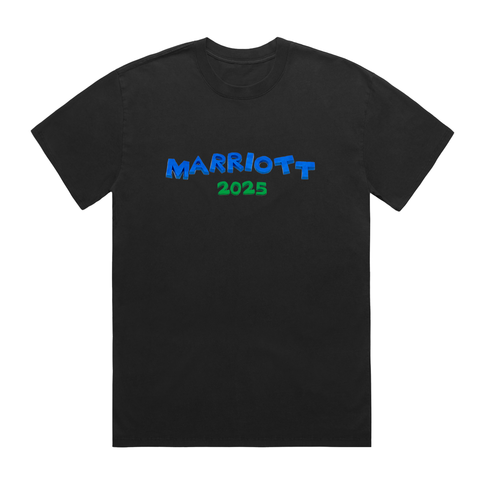 'Marriott 2025' graphic printed on the front and Earth graphic with tour dates printed on the back of a black, unisex tee.
